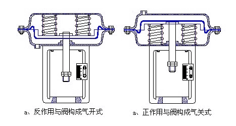 執(zhí)行機(jī)構(gòu)是氣動調(diào)節(jié)閥生產(chǎn)過程自動控制系統(tǒng)的重要組成部分,其有正反兩種作用形式,當(dāng)信號壓力增加,推桿伸出膜室的叫正作用,與閥配合構(gòu)成氣關(guān)式(如下圖)當(dāng)信號壓力增加,推桿退出膜室的叫反作用,與閥配合構(gòu)成氣開式(如下圖)。其原理:當(dāng)信號壓力輸入膜室后,在膜片上產(chǎn)生推力,壓縮彈簧,使推桿移動,帶動閥桿,改變閥芯與閥座之間的流通面積,直到彈簧的反作用與信號壓力作用在膜片上的推力相平衡,從而達(dá)到自動調(diào)節(jié)工藝參數(shù)之目的。