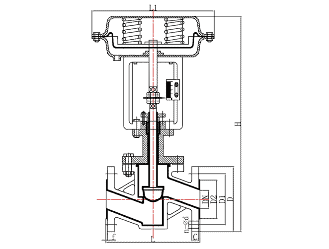 調(diào)節(jié)閥是由氣動薄膜執(zhí)行機(jī)構(gòu)與調(diào)節(jié)機(jī)構(gòu)二部分組成,其結(jié)構(gòu)與原理見下圖(調(diào)節(jié)閥結(jié)構(gòu)圖)。